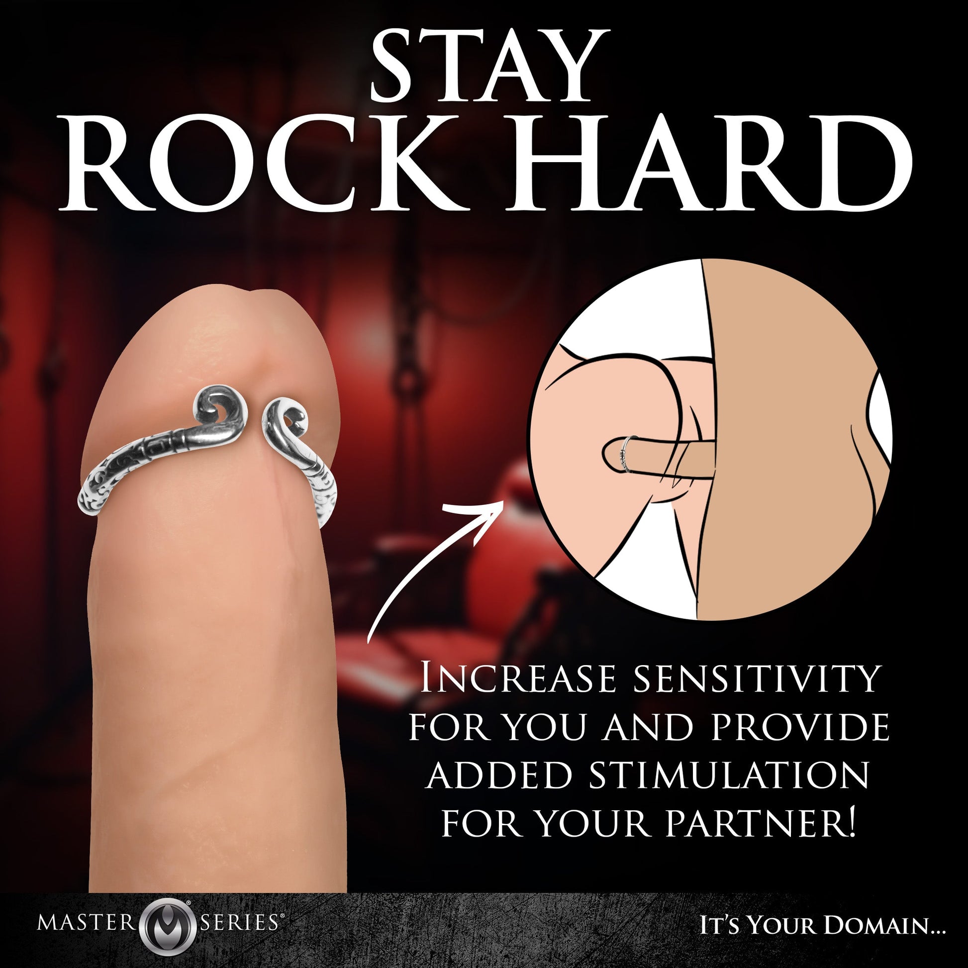 Indulge in heightened sensations and an upgrade to your look with this Kingpin glans ring! The gorgeous design includes whorls of patterns along the ring and curled ends. You're choosing quality when you choose stainless steel that is nickel-free, temperature sensitive, and strong enough to last. The pressure on the head of your shaft will make your head hard and sensitive, enhancing all feeling while you experience pleasure with or without a partner. Your partner will also enjoy the sensation of the ring on the head of your shaft, as well as the improved look! The ring even has an open closure so you can slightly adjust the tightness! To clean, simply wash with mild soap and water. Do not use it during anal play or you risk losing the ring.